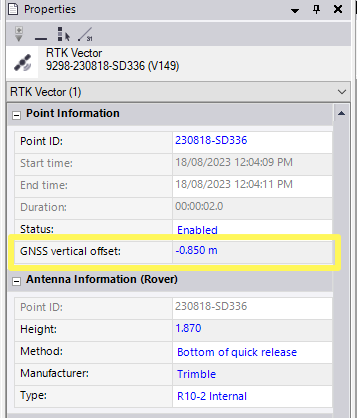 When collecting field data for service locating, trimble access has an awesome feature of being able to input a vertical offset to denote the depth of a locating mark instead of adjusting the height of the gps pole. This value gets saved with in the point meta data that can be reviewed in TBC in the points list in the RTK vector.