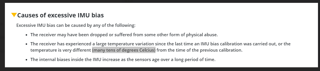 We consulted our Trimble distributor, when do we have to do an IMU calibration on an R12i, and we were told that it was 10 degree Celsius.