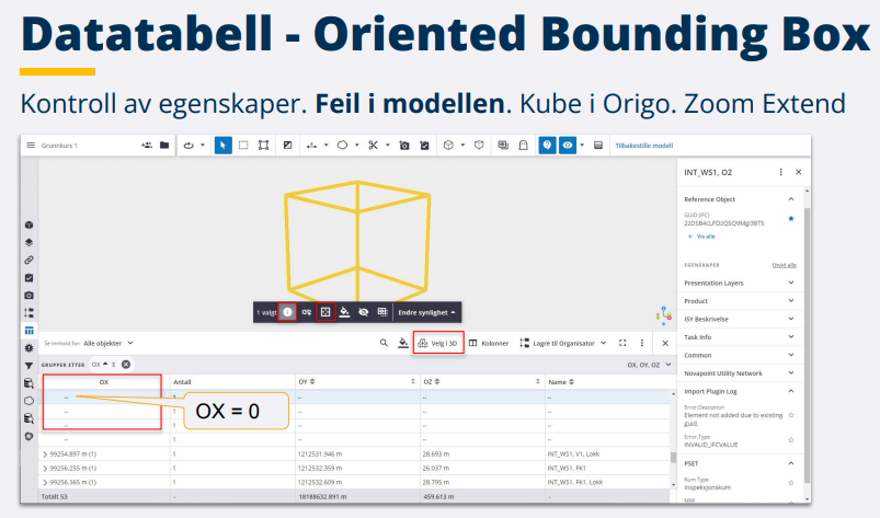 The problem is when one or more objects contains errors, these objects are drawn as a cube at origin, and when the model is far from origin, we are not able to se the loaded model. Zoom extend is too far out. Trimble Connect add a property set named "Oriented Bounding Box". Picture attached. Tips: Use the Datatable to sort/group objects by this property set, and group objects by property OX. The properties/point (OX,OY,OZ) is the object middle point used to zoom in object, and objects with errors ends up in origin (OX,OY,OZ are not calculated). Use the Datatable to select objects with OX=0 (i.e. objects with errors) and Zoom to these objects (from the object menu). This is how you are able to find objects with errors (object missing geometry, object with errors). The picture is a snap from a presentation in Norwegian, hope you are able to understand.