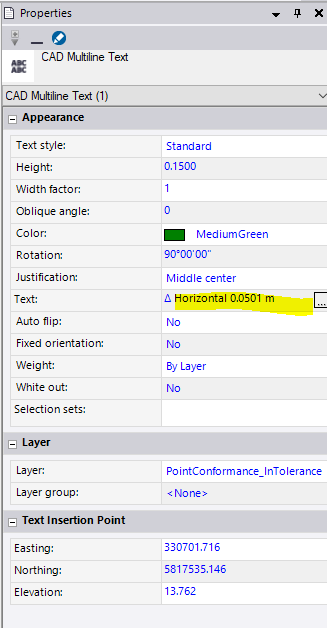 Hi allIn the Point Conformance Report function, is there a way to change the data prefix before plotting/visualising? For example for tolerance mode "distance", the prefix is delta horizontal. I want to shorten it to Hz. In the visualisation tab of the function there isn't a way to change it, only to toggle on and off. Doesn't seem to be in the Text style options eitherAt the moment to change the data prefix, I need to edit each multiline text manually. The text isn't plotted as a point label style