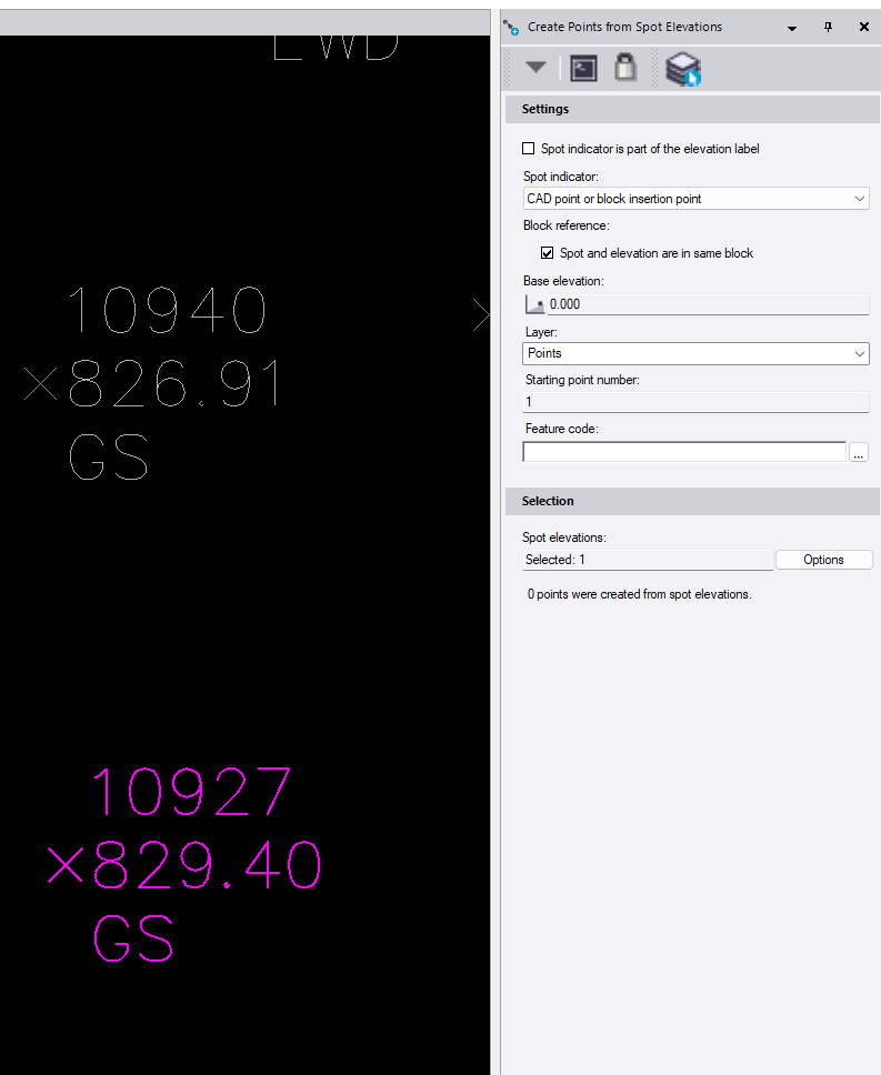 Can anyone help walk me through Creating Points from Spot Elevations when working with existing shots that are part of a block? I have an example of the block below. You can see it is elevated and I would like TBC to create a point at the insertion point of the block with the elevation of the block. However, no matter how I select the options it won't create a point.