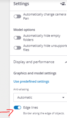 Could you please try the Edges settings (Screenshot below) in the Settings panel to see if it solves your issue. If it doesn't solve the issue you are facing, could you please send the model details to our Support (connect-support@trimble.com) .