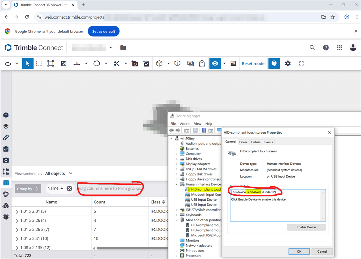 Update: with some exchange of messages with Trimble support I have been able to identify the issue further. It seems that when Trimble Connect knows you have a touch screen, the drag and drop gets automatically deactivated.