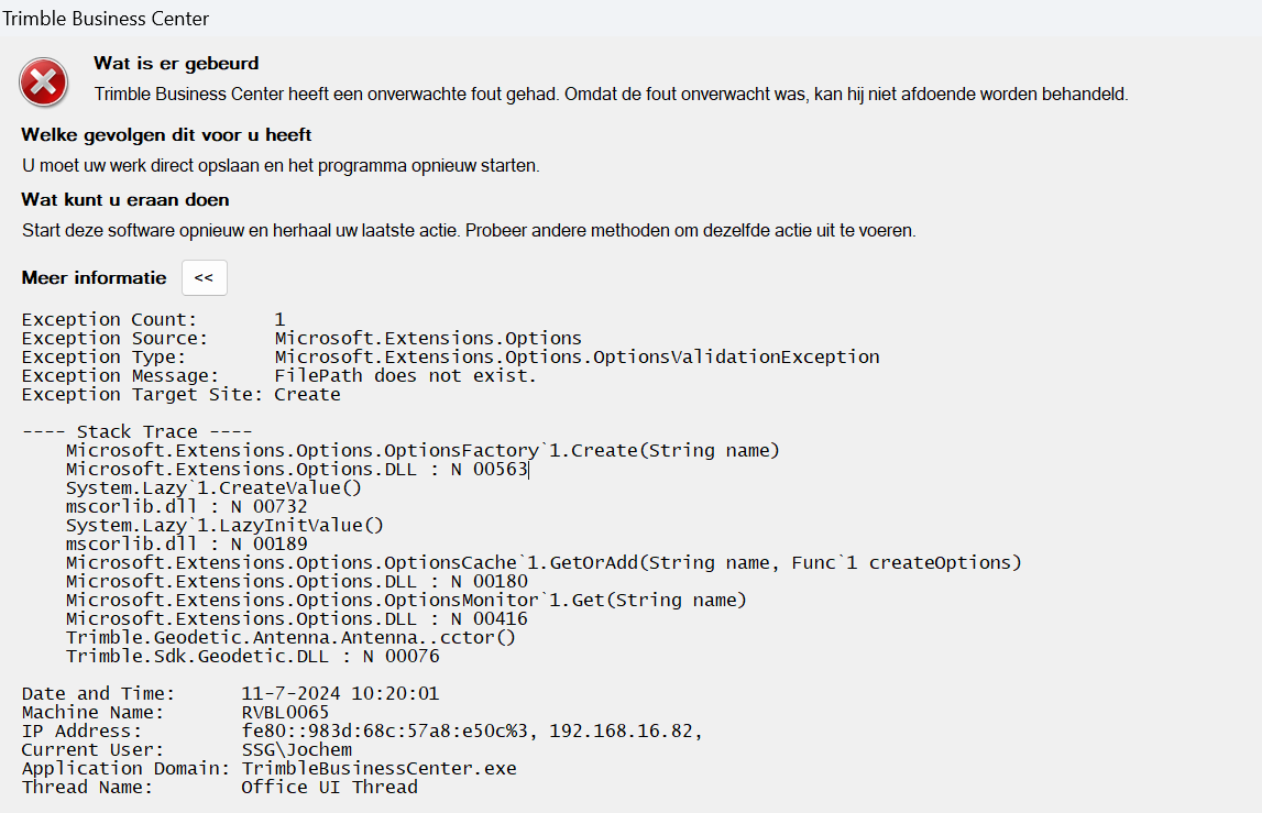 Trimble Business Center experienced an unexpected error. Because the error was unexpected, it cannot be adequately addressed.
