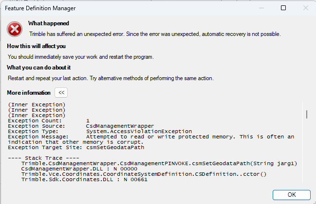 I downloaded Trimble Feature Definition Manager on my work PC with Windows 11 (new computer in January) and keep getting the following error message...