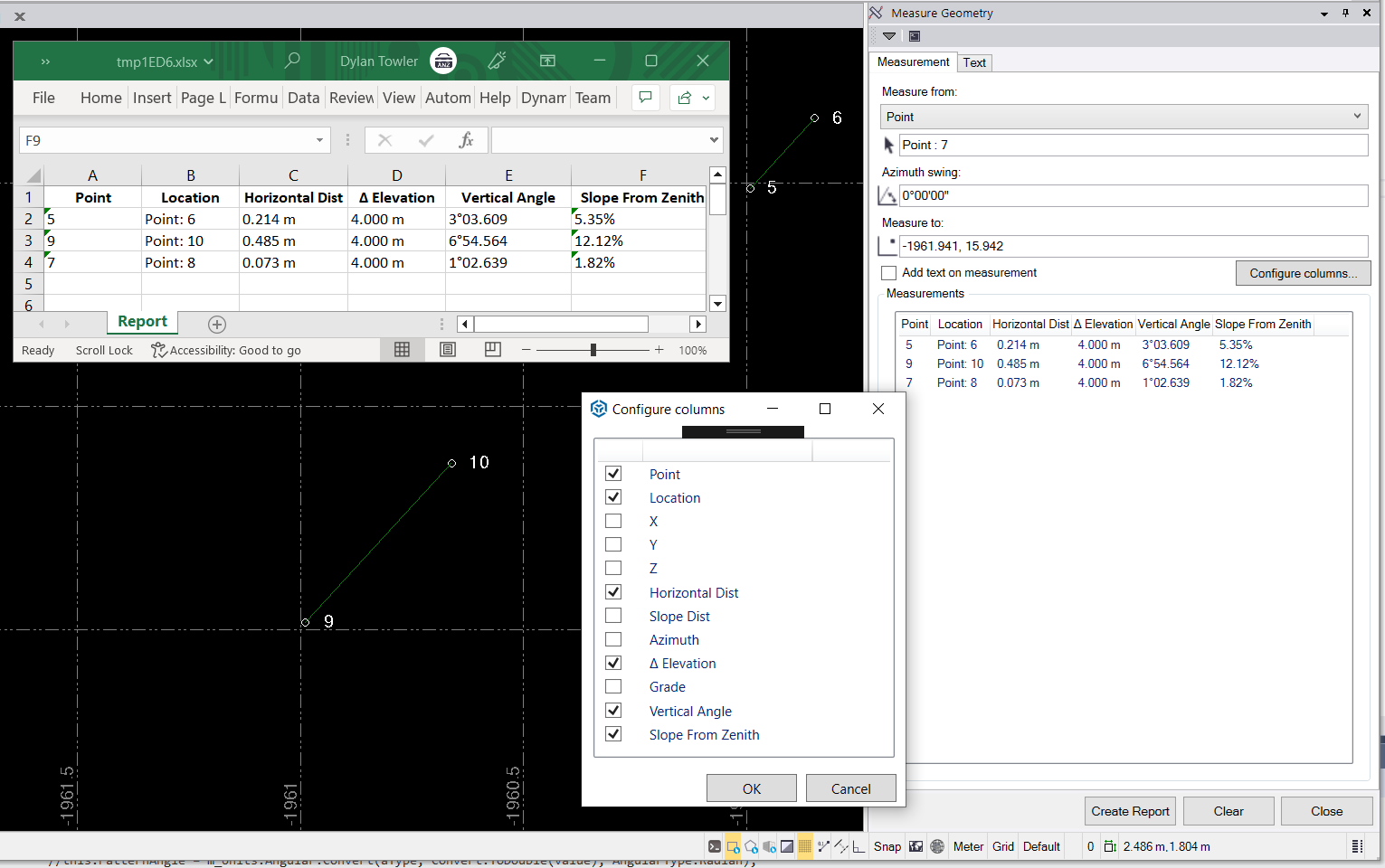 I think you're one of our customers so you should already have access to the ANZ Toolbox. We have a command called "Measure Geometry " in Beta that I think will solve this problem for you. It allows you to select a Line or a Point and then measure various geometric properties in relation to other points/nodes. You can then create an excel report and annotate text (with a bunch of options) to a specified layer. As with all of our measure commands you can configure the columns and the text annotation fields you want to be visible. See screenshots below for the configuration I think would work for the workflow you describe.