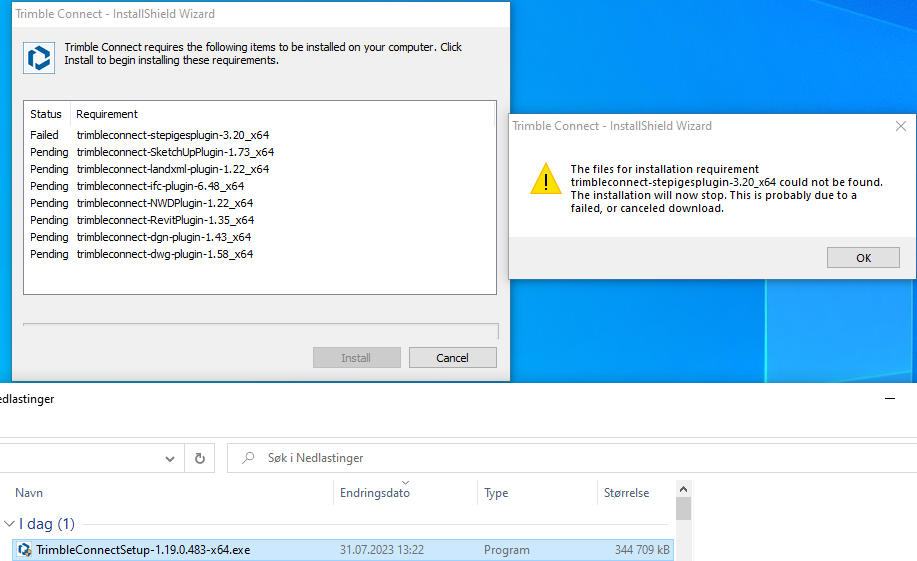 I am trying to update Trimble Connect for windows to the newest version. Before the installation starts I get a InstallShield Wizard error and the installations stops.