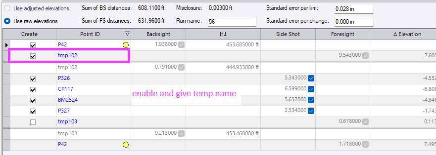 Finally, because the overall level work doesn't appear progress linearly, I think may be best to process this with Least Squares. Make your life easier by eliminating the import of temporary (not to be used again) turn points. TBC counts the number of turns so it will propagate the error correctly. Then I always added a geographic coordinate to all points I didn't have a good Hz position for. This allowed me to view the level file in 2D (another one of those things that is spectrum related, lol).