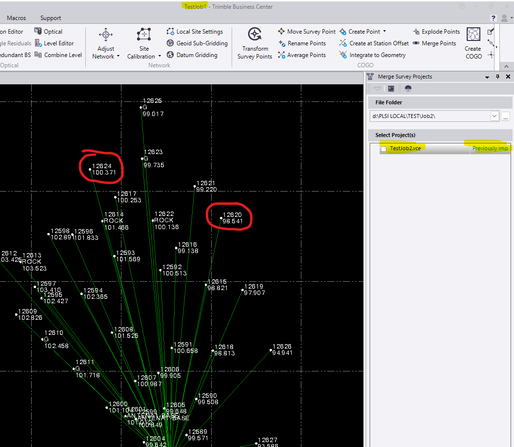 In the next screen shot you can see I am importing the above file into Test Job 1. Using the merge Survey projects command: