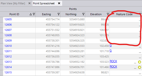 Points that are associated with a line feature code have the feature code completely removed. However, points that are not a Line or Polygon related feature show up just fine. In this example a "G" (Ground) Point shows up fine.