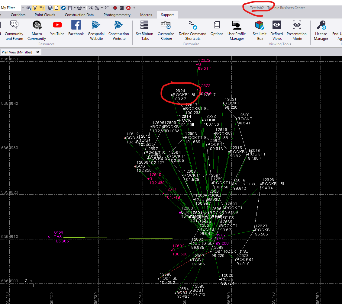 Below is a screen shot of Test Job 2 when the job file is imported directly into TBC. You can see the linework processes out correctly and Feature codes are populated for line features.