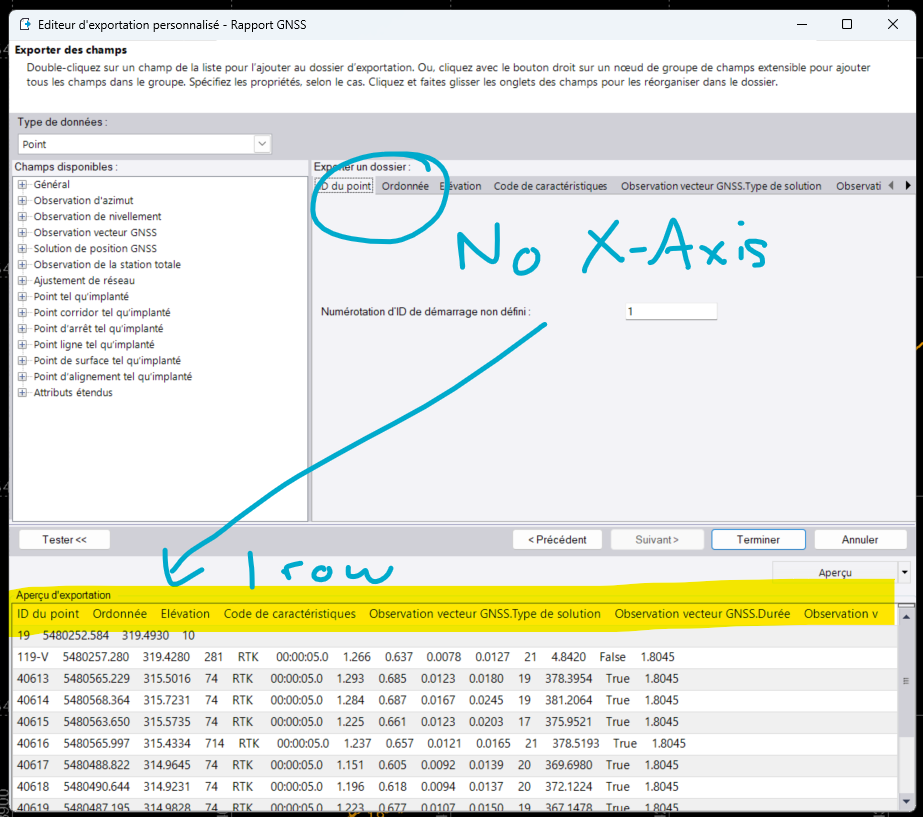 I have an issue with the personnalized export editor. I want to show the heading in the .csv export. When I add the X-Axis data, it creates a second row in the heading. All the heading titles are then OFFSET with the data. It seems to be only the X-axis label that creates this, because when I remove it, the heading is only on 1 row.