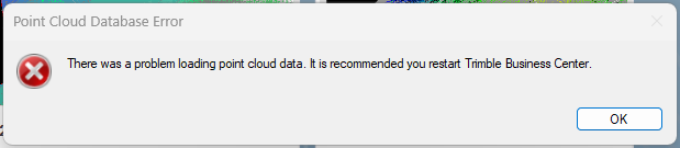 I have been processing a large set of scans and upon extraction, reclassification and a bunch of cad work, I saved the project with a new name. Now when ever I open the new verison, or the previous version I receive the message below, resetting/restartig the pc doesn't help, I always receive this message when opening the file. Oddly, some point cloud, closest to a handful of stations, loads up but 90% does not. I really have no idea what to do here, any pointers are appreciated! How can I get the point cloud data back?