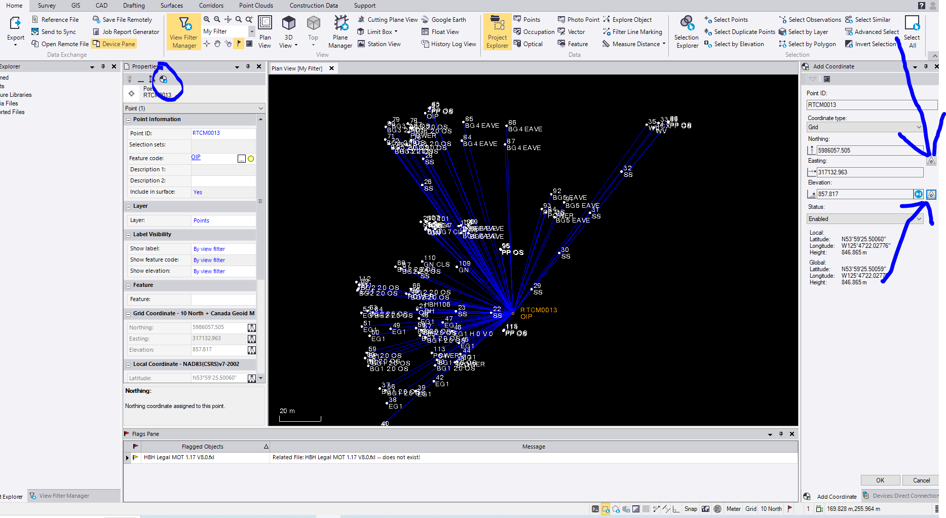 unfortunately when you bring in your data from the data collector, the data collector has assigned 'coordinates' for each point. lets say that you take an average rtk observation or double a total station observation to a point, then the resulting average is a coordinate in the data collector, all points get these, even imported points. our workflow is to erase all these data collector coordinates. select all/then advanced select/drop down to coordinate/then expand your data collector file and they should still all be highlighted. typically you can delete all these, unless you need some of them for something(if they are known good coordinates). then create a new coordinate for you base station and call it control quality, and typically adjust a network for the project.