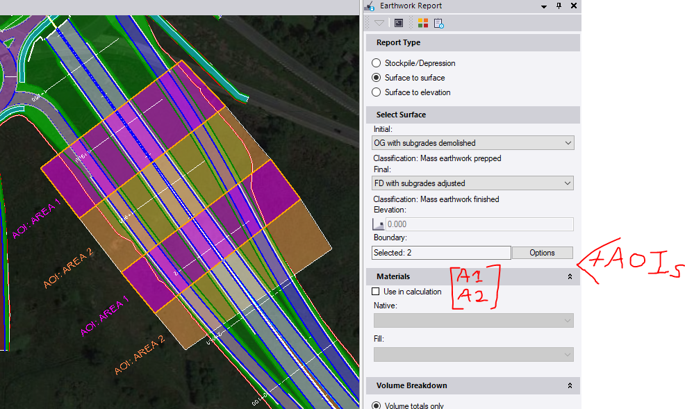 It is much much faster for me to just run earthworks reports and sum them in excel myself which seems a little mad, the below was all done pretty quickly using volume boundaries and the earthworks volume report function. I built the take-off surfaces and then run bounded volumes between them.