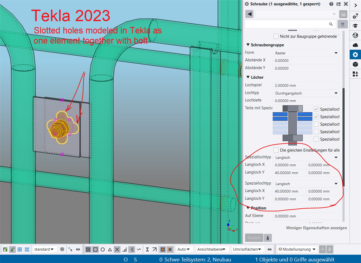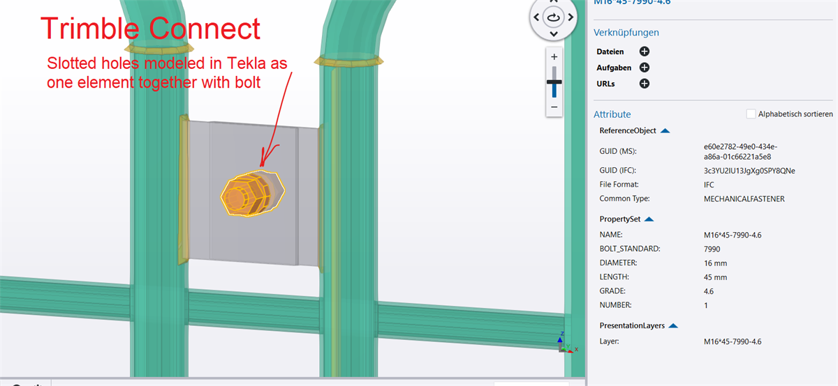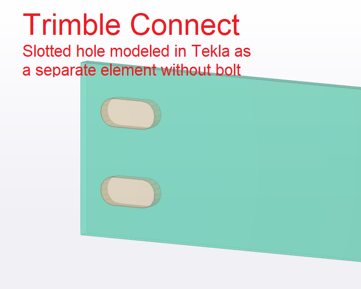 The slotted holes which are modeled in Tekla as one element together with the bolt (Screenshot 1) do not appear in Trimble Connect (Screenshot 2).