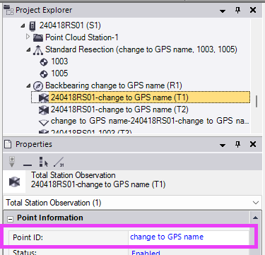 there is likely a way to do this with transformations. but what we would do and i think what ronny is suggesting is to merge the total station point stn1.1 to the gps point stn1. to do the merge you just change the name of stn1.1 to stn1 and tbc will prompt to merge them together and you say yes. does not matter if you do it in points or down in the observations, i don t think anyways.