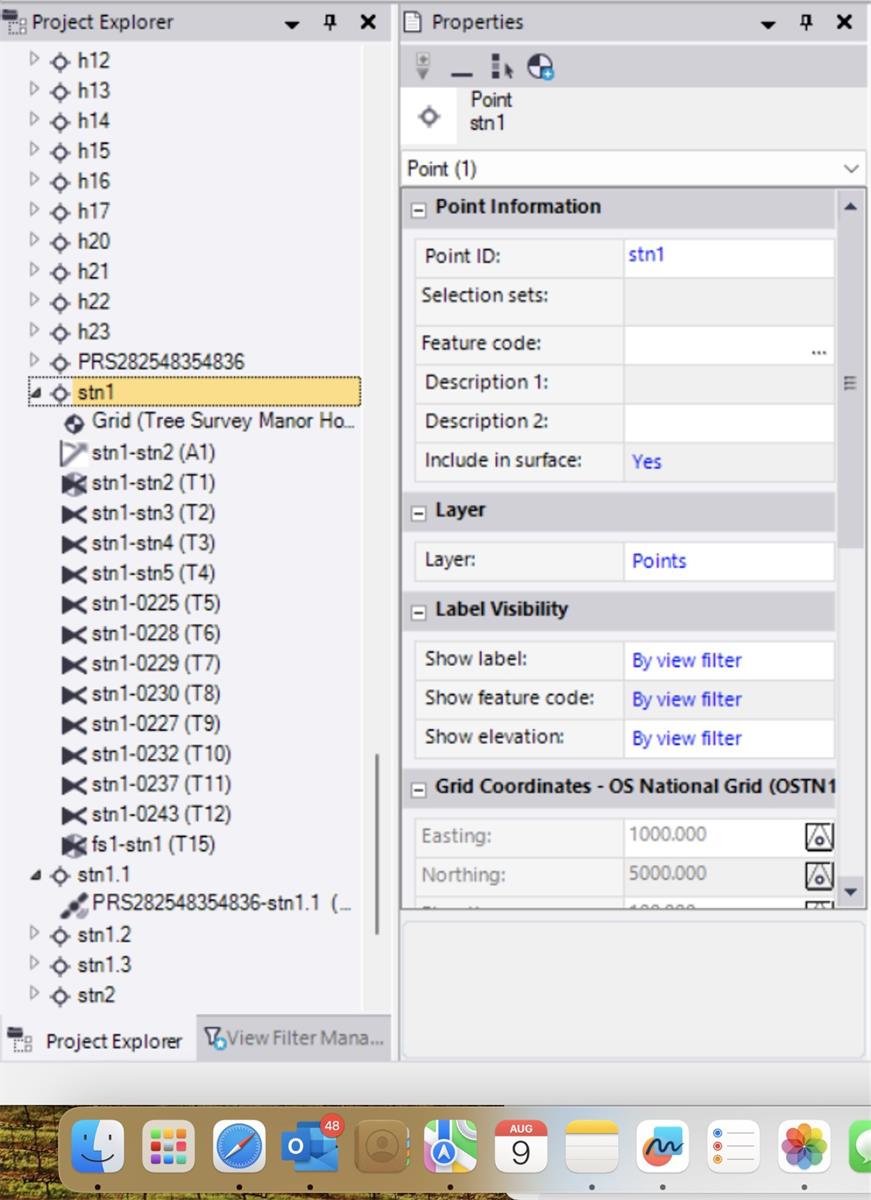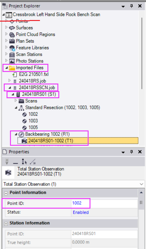 then we would delete the 1000/5000 coordinate that the data collector stored for the initial total station setup and all other coordinates the data collector stored because we want the raw observations to be used and tbc will flag the shift from the data collector coordinates to the new georeferenced correct coordinates. select all, then advanced select, dropdown for coordinates, open dropdowns to the imported files and right click on the coordinates that should be highlighted and delete.