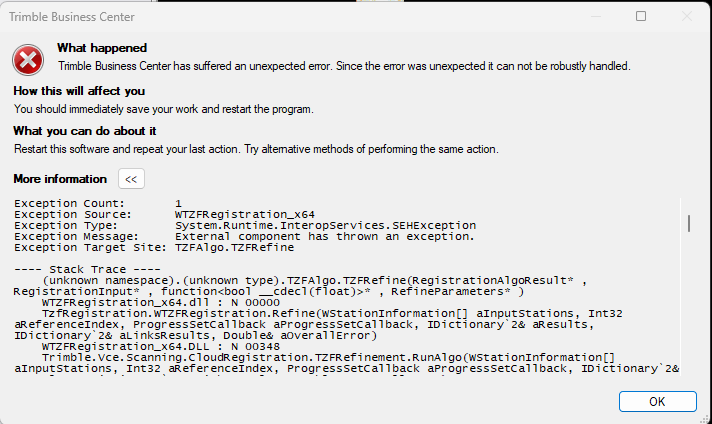 I have had this issue many time while doing importing and refining scans with the SX10 and X7. Ive brought it to the attention of our dealer who recommends reinstalling TBC, but that also brings with it many unwanted issues. I would love to hear what trimble have to say