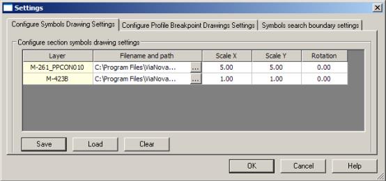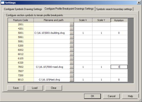 Under Configure Breakpoint Drawings Settings, you get a list of all feature codes. This feature code is read from the cross-sections. You can then decide what symbols to connect to a feature code. If no symbol is connected to the feature code, only the text will be written in the drawing. If a symbol is defined, both symbol and text will be drawn.