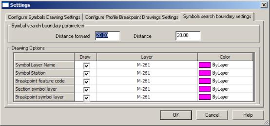 Under the folder Symbols search boundary settings you can define what object to search for in the cross section as well as what distance to use as a boundary.