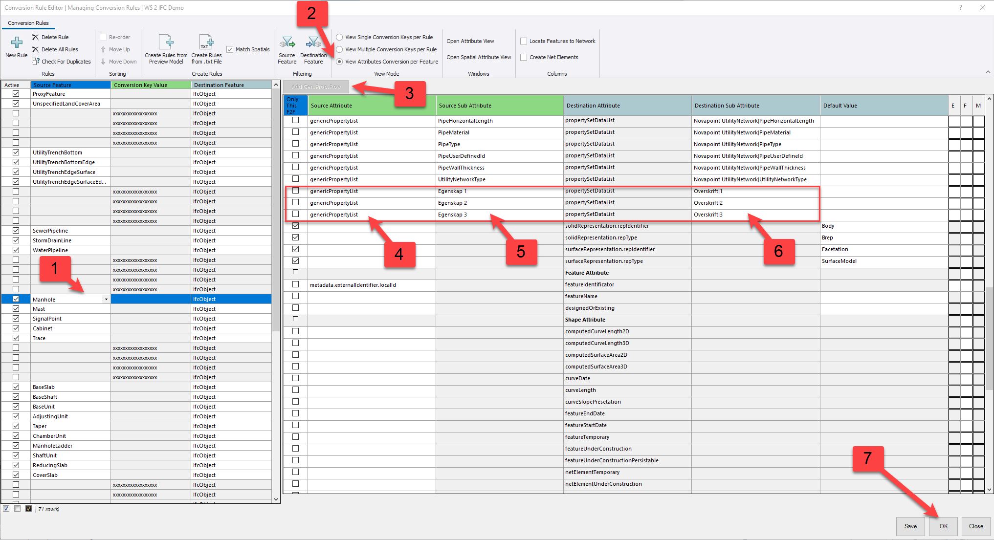 In order to export the properties that you have created, you will have to add this to the conversion rule. You can do this by these 7 steps.1. Activate the line with "manhole" (we want to choose an object that we know we have added properties too)2. Then click “View Attributes Conversion per Feature” (the window below will appear)3. Press “Add Gen. Prop.Row”4. Use the drop-down menu to choose "GenericPropertyList" (important to use drop-down menu)5. Use the drop-down menu to choose the property which you have created (see picture number 1 above).6. Write first the name of the headline you want for your properties, then separate by adding this symbol | (vertical line) then write the name you want for that specific property on the other side of the line. 7. Save the conversion rule and close.