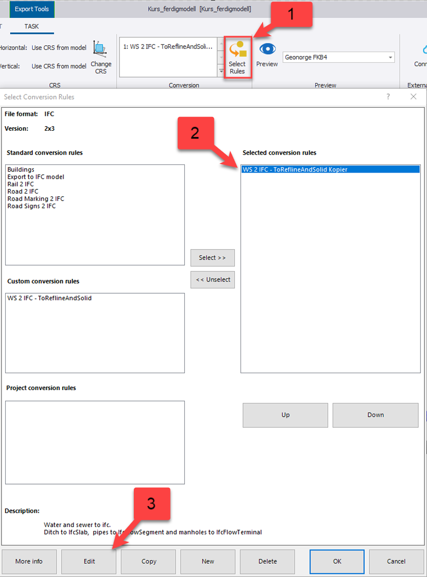 Chose one suited conversion rule (for example "WS2IFC" (Water and sewer 2 IFC)) and then press edit.