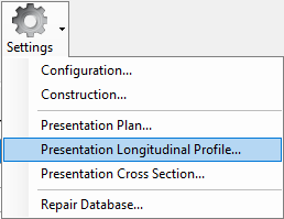 The dialogue box under settings selection “Presentation longitudinal plan” includes the following flags, all controlling parts of how the project is to be presented in the longitudinal profile view/drawing.