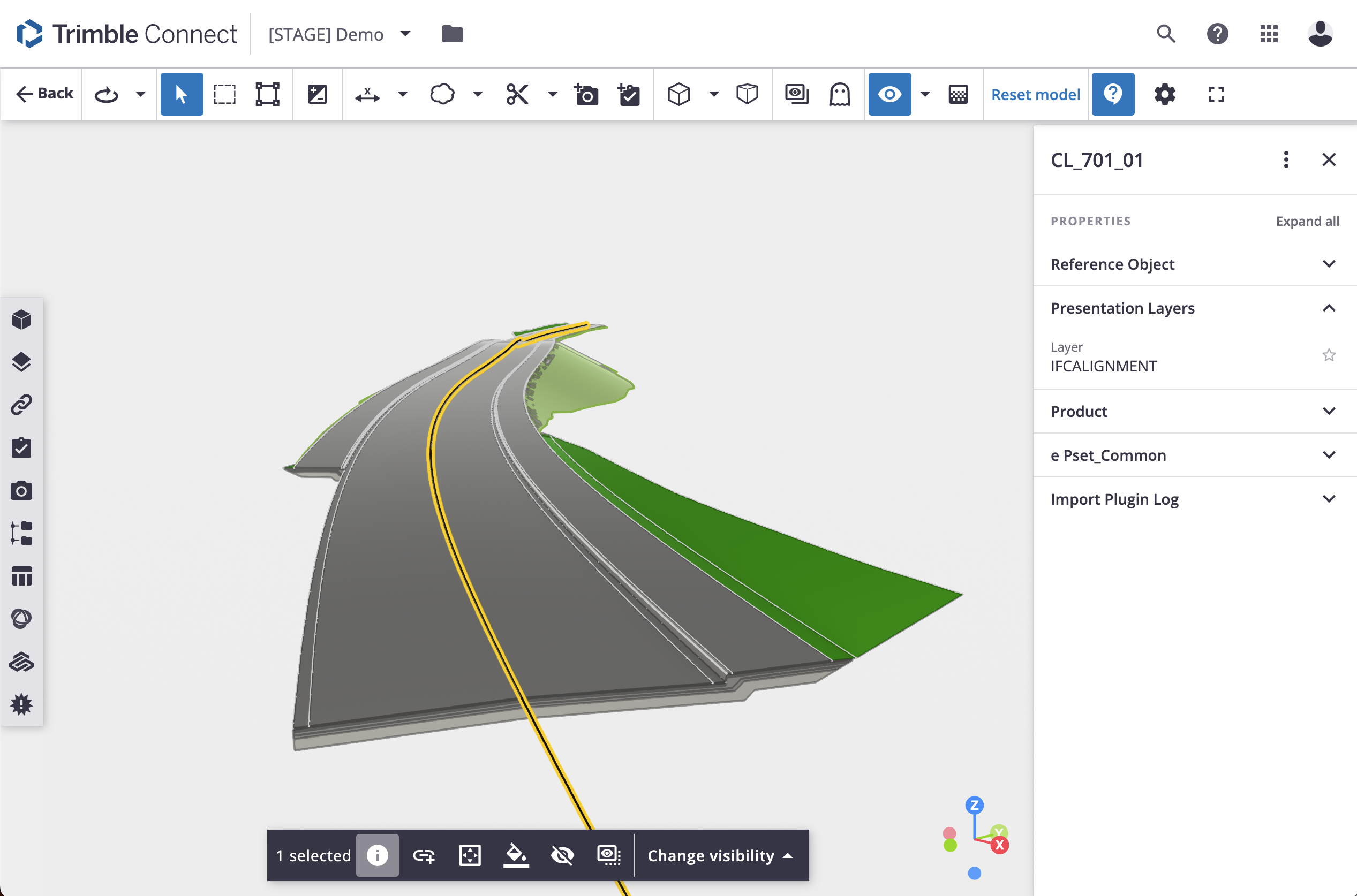 Path navigation mode in Trimble Connect 3D Viewer allows you to move along linear features such as a road alignment or a centerline. This mode provides a view that follows the path, giving a continuous perspective along the selected linear object.