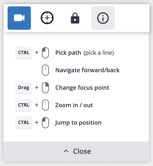 Activate Path Navigation mode. From the camera controls in the top toolbar, change the default "Rotate" mode to "Path navigation". A help panel with command information will appear. You can close this for better visibility.