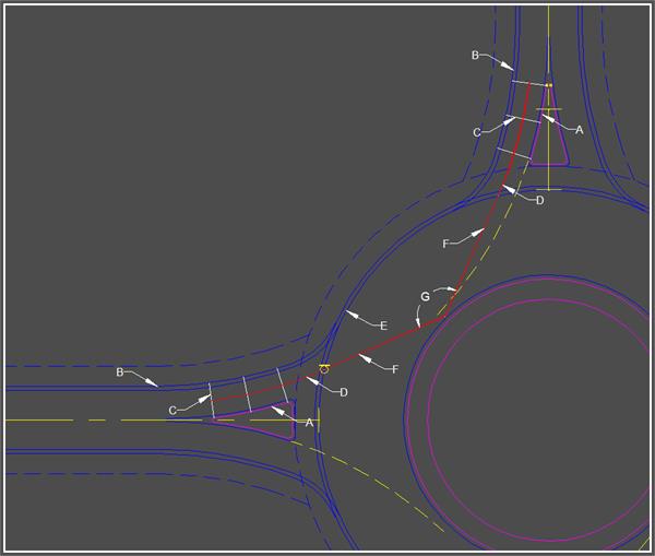 Deflection and 'Entry Angles' are the two main ways to check the 2D design of a roundabout. All roundabouts must adhere to the rules of these parameters. Deflection is meant to be as crucial as 'Entry Angle' though it is much easier to fix than 'Entry Angle'.