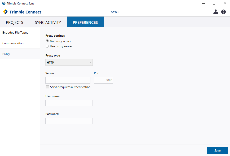 3. If, you are using a proxy enter these settings in Trimble Connect Sync under Preferences.