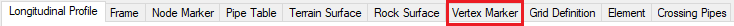 Here you set data for marking of vertices in the profile part of the longitudinal profile drawing. This includes layer name in the drawing, color, and line type, with which text style vertices are to be drawn, from which file the text style is gotten, possible text prefix for the name, and the number of decimals in the station number.